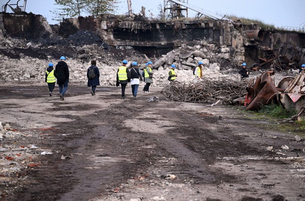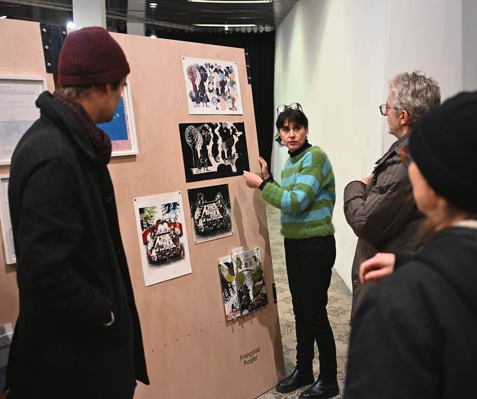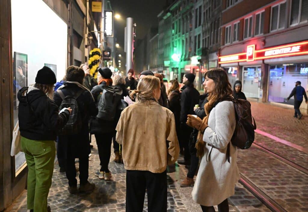 In the afternoon, Hassan of “Des Racines et des Ailes d’acier” guided us through the ruins of a decommissioned steel factory in Seraing, a neighbouring city of Liege. The site closed down 15 years ago and fell into ruin ever since. When we visited there were clear signs of transformation, with large machinery the former factory was cut into parts. Only the former heart, the 84-meter-high blast furnace will stay and become the center of an area were heritage and more sustainable industry will be combined. Before we headed to dinner, we visited the art center Les Brasseurs, were we got an introduction into the ATI Collection, a private library that collects works from illustrators of children books and youth literature. Later on, quite tired but still motivated, Maxime Moinet guided us through the city, exploring the various spots of Art-au-Centre, an initiative that transforms empty shops into exhibition spaces.