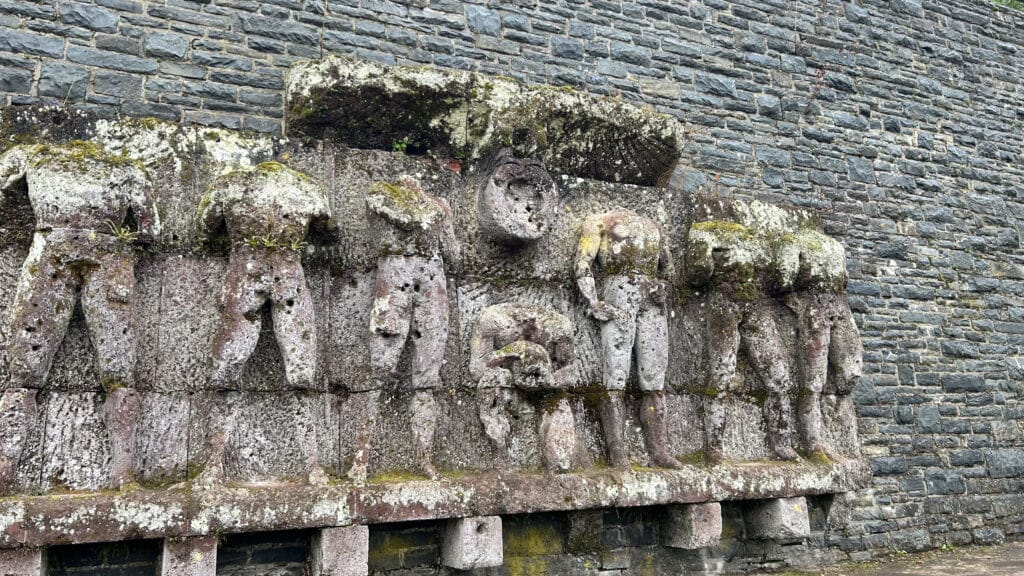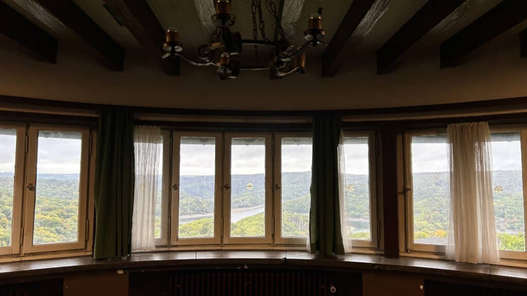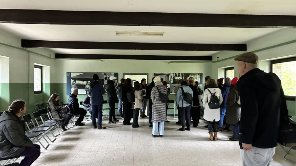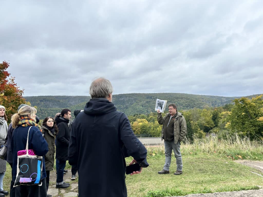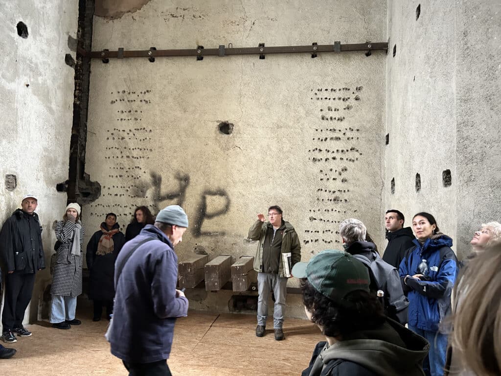 The first day of the field trip was spent at Vogelsang IP in the Eifel region, a site originally built as a Nazi Ordensburg to indoctrinate future party leaders. Its monumental architecture remains a chilling example of how space was weaponized to project the myth of the „master race.“ Following the war, the site underwent a pragmatic transformation, serving as a training ground for British and Belgian military forces until 2005. During this period, many Nazi symbols were either removed or obscured—such as the conversion of the Hall of Honor into a climbing wall. Today, the site has been successfully repurposed as a center for education and remembrance. Led by scientific director Stefan Wunsch, the group explored the grounds and the permanent exhibition, „Destiny: Master Race,“ which encourages visitors to reflect on the past and its relevance to modern social issues. Notable highlights of the tour included the Adlerhof complex, a former seminar room housing the Ehrenhalle (Hall of Honor), and various rooms not usually open to the general public, such as the Burgschänke. We also caught glimpses of the torchbearer relief, the Sonnwendplatz, various sports facilities, and the open-air stage, all of which continue to echo the period’s aggressive claim to power and its eventual tactical uses.