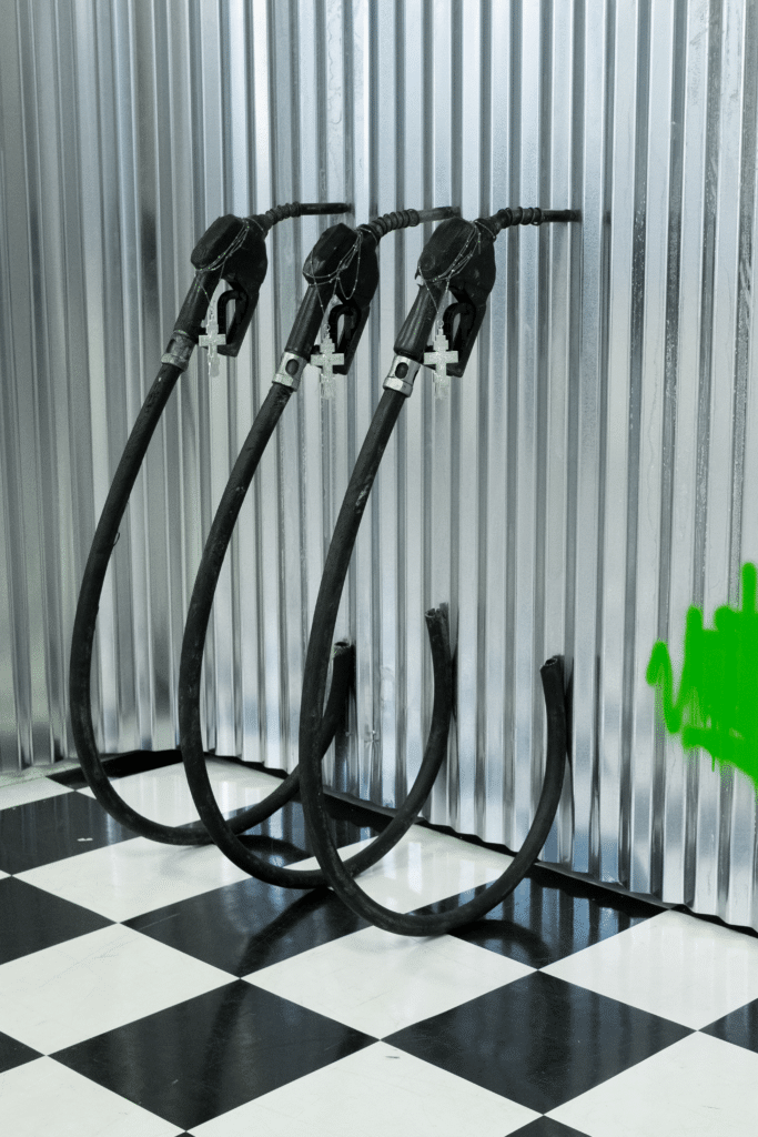 Tiko is a multimedia artist based in Tbilisi, Georgia. Three petrol pistols, adorned with crosses, symbolize unchecked capitalism and the sanctification of profitable resources, disregarding human health and nature. Through salvaged pistols and crosses, the artist demonstrates the boundlessness of systemically entrenched forms of power in Georgia and globally.