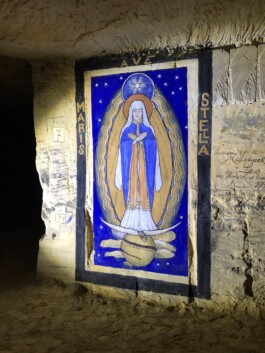 For a good hundred years, the monks painted the walls of the tunnel system with a wide variety of motifs: from replicas of famous sacred art and comic motifs to replicas of important architectural history, such as a room modelled on the Alhambra or 3D models of their countries of origin. The tunnels of the Cannerberg, which is also known today as the Jesuit Mountain, have plenty to offer. In addition to numerous murals, they also carved chancels and dining rooms into the sandstone, which are still used today for baptisms, weddings and private celebrations.