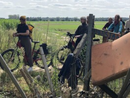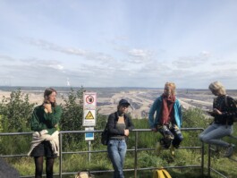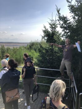 On the sunny, but already autumn-crisp morning of September 21st, the Borderland fellowship holders met at the train station of Kerpen-Buir. Equipped with E-Bikes, they started off into the area of the Hambach Tagebau, the biggest brown coal open pit mining in Rheinisches Braunkohlerevier. Guided by Todde Kemmerich, artist and climate activist, they explored a landscape that has been shaped by industrial mining for over 150 years. A talk with Georg Gelhausen, mayor of the city of Merzenich, introduced the Borderlanders to the complexity of the situation and the reality of living in an area that was (or, in some cases: still is) supposed to be demolished for private profit and public energy supply. An encounter with the climate activists living in the highly controversial forest of Hambach left them with lasting impressions of different approaches to how humans live and interact with nature.
